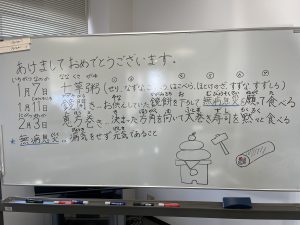 季節の言葉(①七草粥(ななくさがゆ)、②鏡開き(かがみびらき)、③恵方巻き(えほうまき))を学んだり、漢字プリント、日本語で会話を楽しんだりしました。